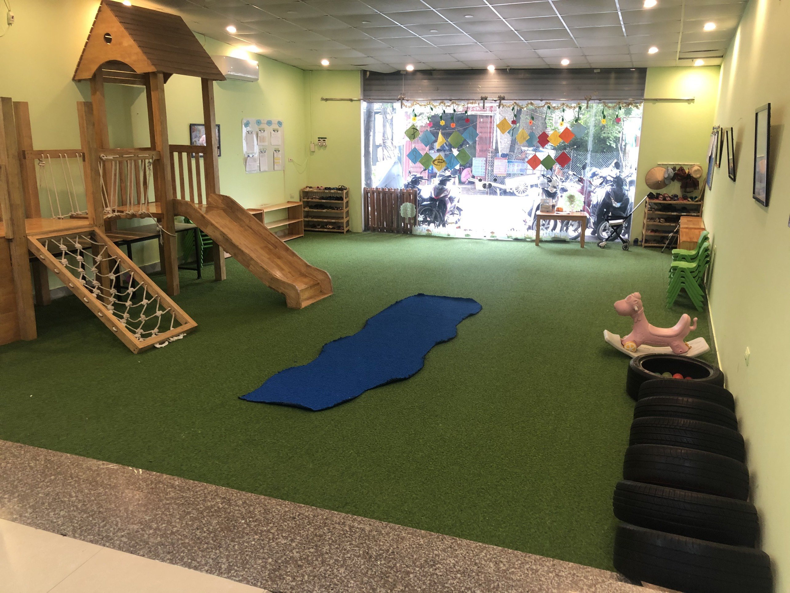 - Sân chơi rộng gần 100m2 được trải thảm với khu liên hoàn nhà gỗ, cầu trượt cho thoải mái vận động hàng ngày.