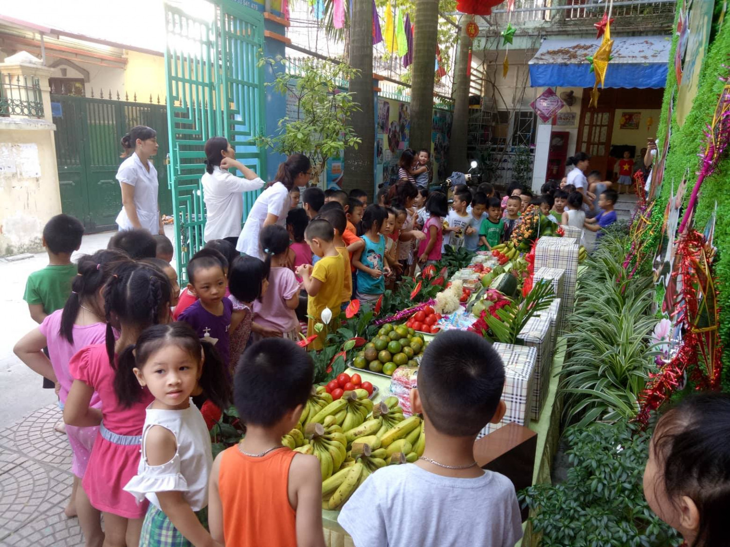 trời đảm bảo an toàn, phù hợp với trẻ. Có cây xanh, thảm cỏ, giàn cây thường xuyên được chăm sóc cắt tỉa đẹp. Có vườn cây của bé, tạo điều kiện cho trẻ chăm sóc cây hàng ngày. Sân vườn được quét dọn sạch sẽ, bố trí sắp đặt gọn gàng khoa học, đảm bảo cảnh quan môi trường sư phạm xanh, sạch, đẹp. Các mảng tường được tận dụng và trang trí thành các khu vui chơi sáng tạo cho trẻ, hơn nữa còn tạo một không gian sinh động hài hòa.