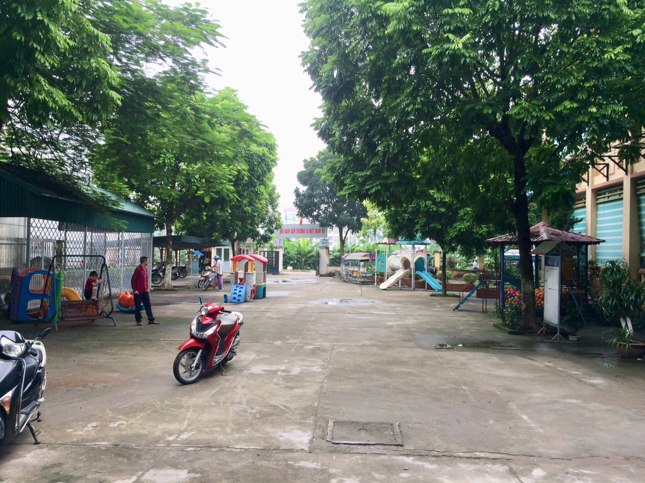 Sân chơi nhà trường rất rộng rãi, thoáng mát rộng rãi với đầy đủ các đồ chơi phong phú ngoài trời: Cầu trựơt liên hoàn, xích đu, vườn cổ tích, thú nhún, đu treo quả cầu, nhà bóng. Phù hợp với cảnh quan môi trường sư phạm.