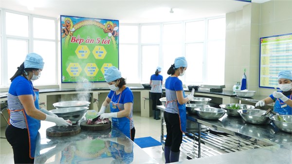 Hệ thống bếp một chiều và khâu sơ chế thực phẩm. Một buổi khám sức khỏe cho trẻ do nhân viên y tế thực hiện