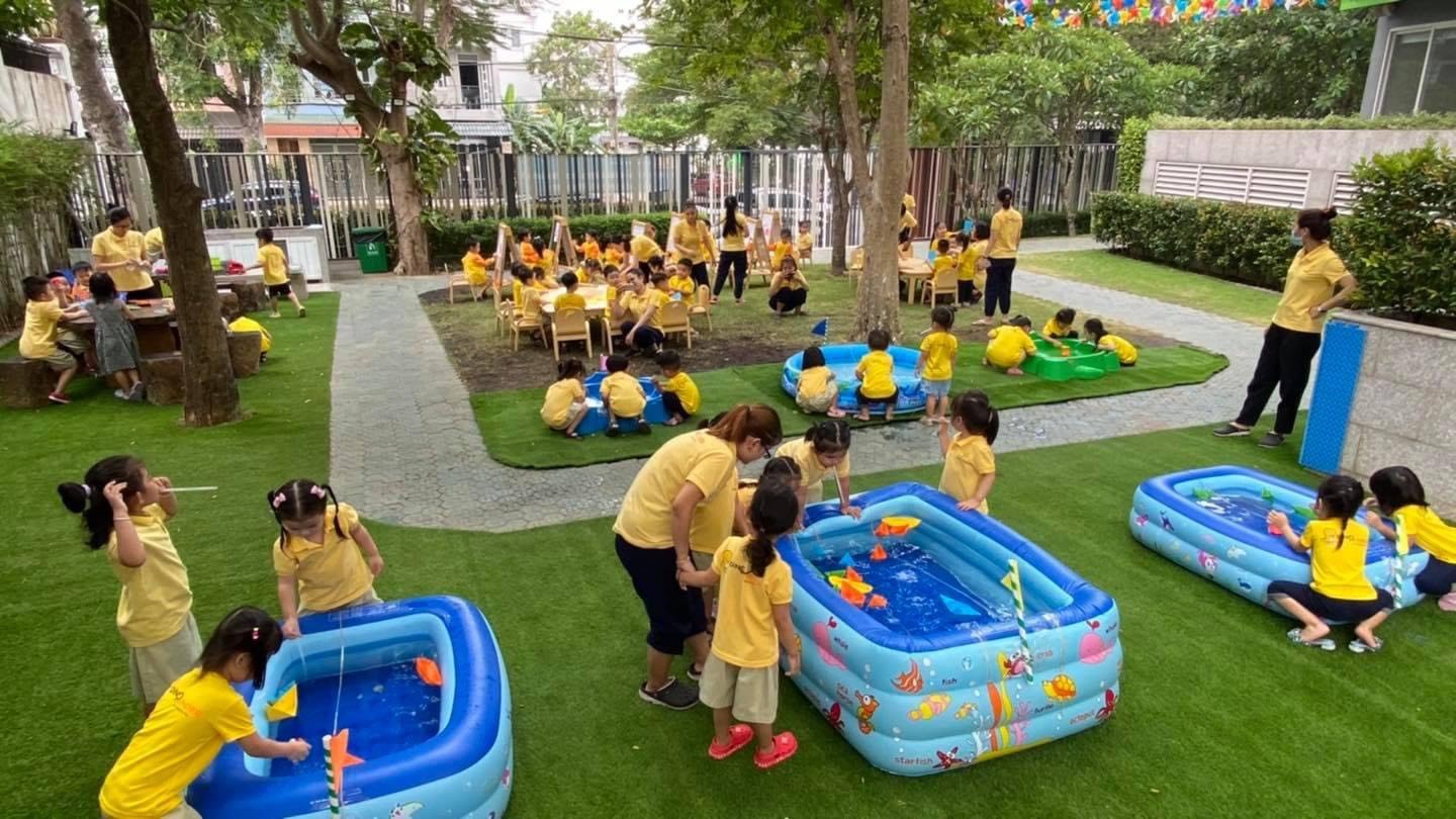 Sân chơi rộng , nhiều cây xanh; phòng học rộng rãi, nhiều cửa sổ thoáng mát