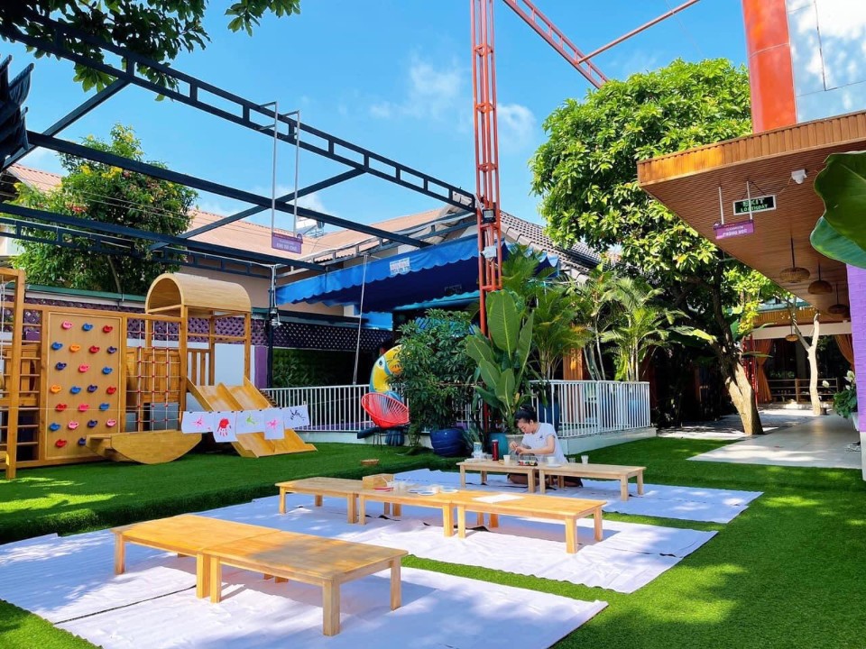 - Sân chơi rộng rãi và mát mẻ với nền được trải thảm cỏ xanh mát, là nơi những đôi chân bé nhỏ tha hồ vui đùa chạy nhảy.