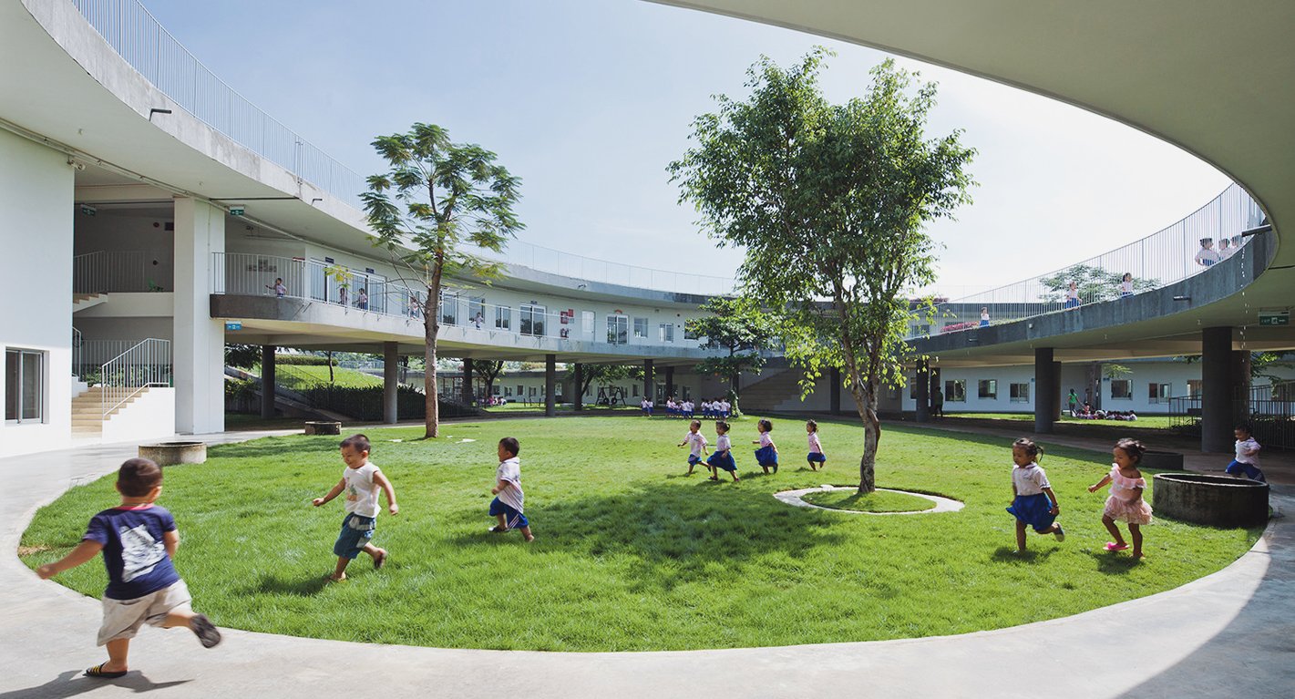 Điểm đặc biệt nhất của trường mầm non ở Biên Hoà là thiết kế hình xuyến kết nối mái nhà với sân chơi tạo nên một màu xanh trải dài cực đẹp mắt. Mái vòm này được giảm dần độ cao cho tới khi chạm tới mặt đất. Tất cả các phòng học và phòng chức năng đều nằm ở dưới. Mọi nơi tại đây đều được bảo vệ bởi một hàng rào chắc chắn để đảm bảo an toàn cho các em nhỏ.