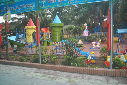 Trường có sân chơi rộng rãi với nhiều loại đồ chơi ngoài trời nhằm phát triển thể chất cho trẻ.