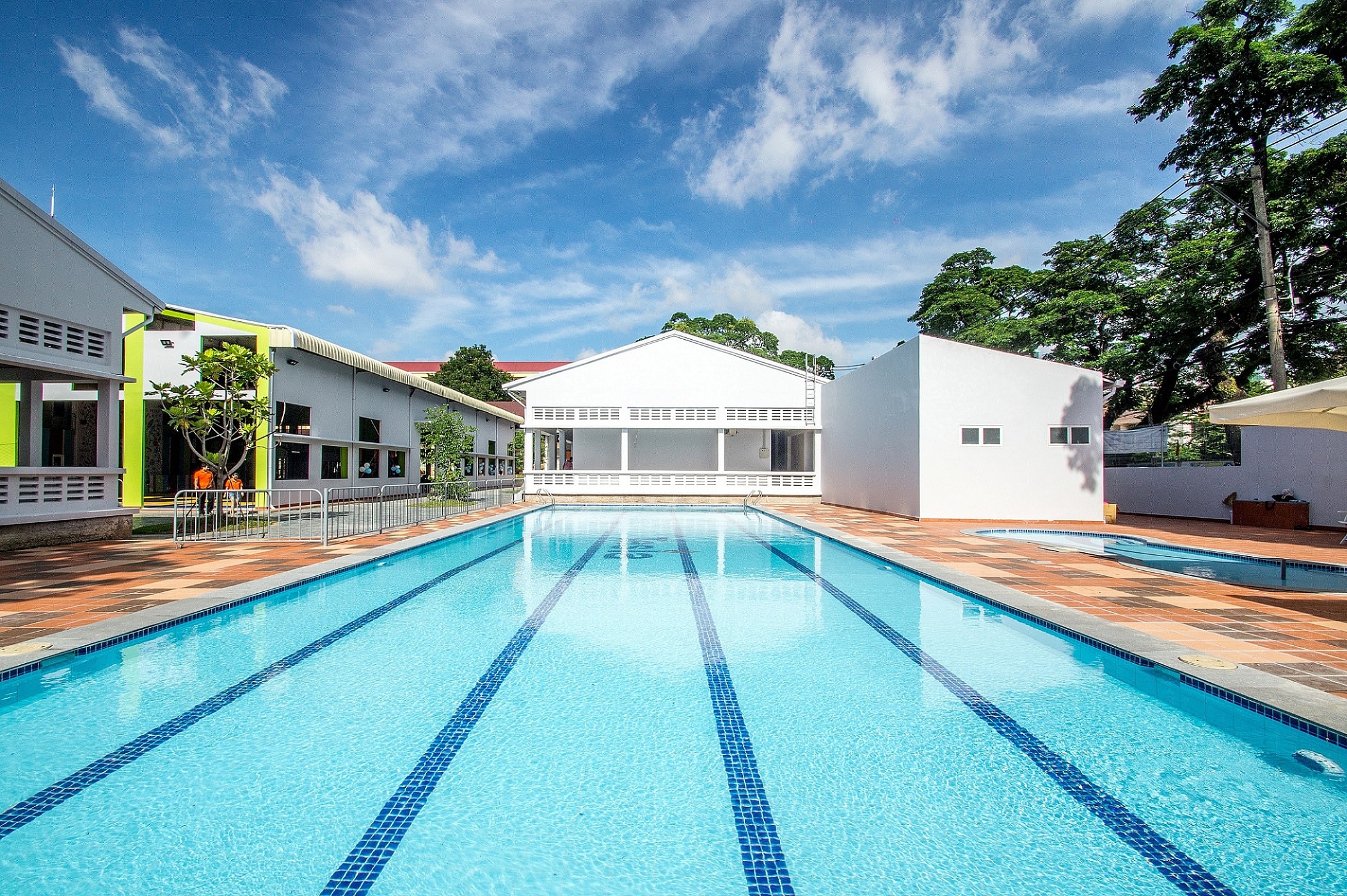 Trường có hai hồ bơi gồm: Một hồ dài 25 m ngang 10 m sâu 0,9 đến 1,5 m, một hồ sục khí massage đường kính 3 m sâu 0,4 m phù hợp với từng độ tuổi, được khử trùng tuần hoàn bằng công nghệ muối mới nhất hiện nay.