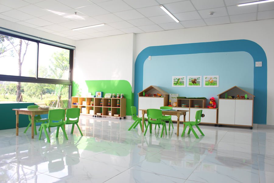 Phòng học rộng rãi, sạch sẽ, tận dụng nhiều ánh sáng từ thiên nhiên giúp con phát triển sức khỏe mạnh mẽ