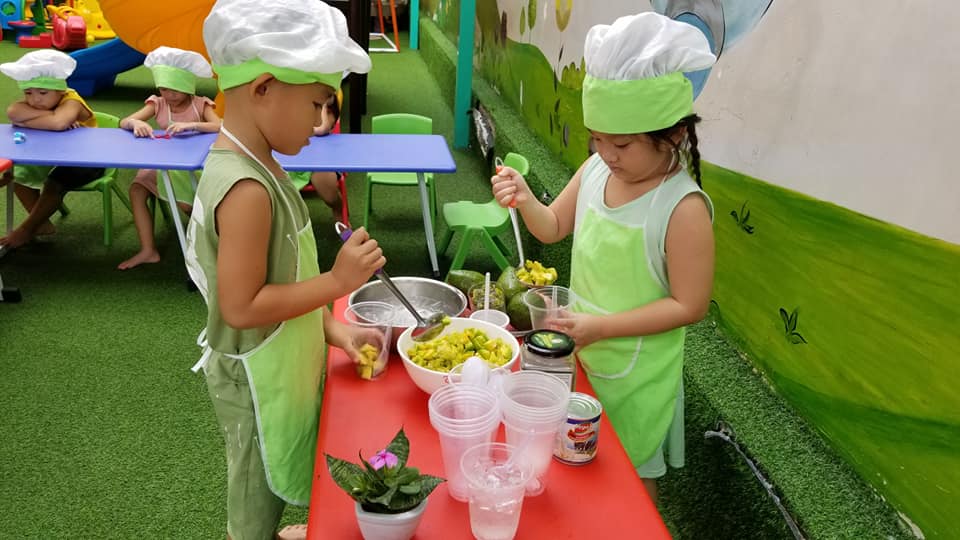 Thực đơn thay đổi hàng tuần để có thể cung cấp đầy đủ dinh dưỡng và đa dạng món ăn cho trẻ. Nguồn thực phẩm được cung cấp từ siêu thị tất cả đều có giấy kiểm tra an toàn thực phẩm. Ngoài các bữa chính (sáng, trưa, xế) các con còn được dùng thêm sữa, các bữa phụ xế như bánh flan, sữa chua, nước trái cây,...