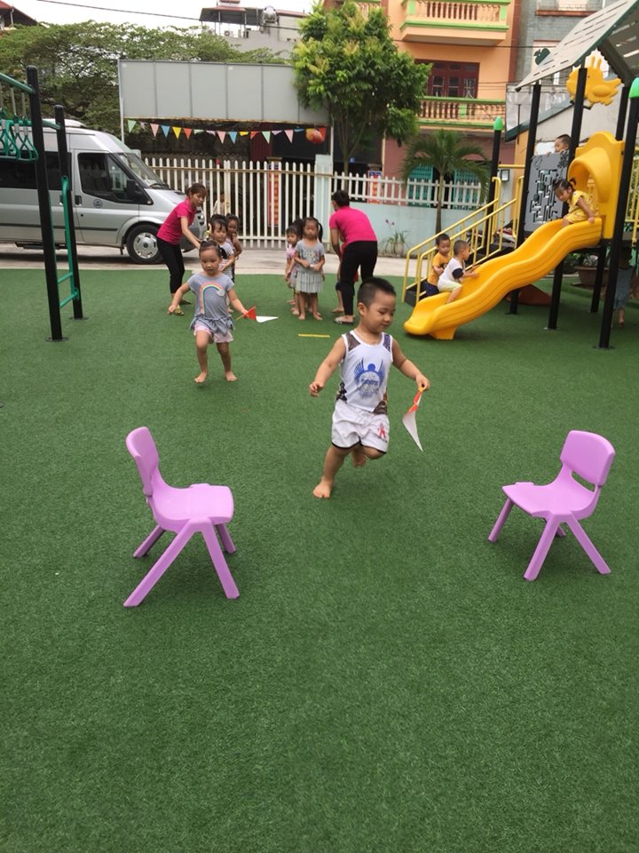 Môi trường rộng rãi, thoáng mát với sân chơi ngoài trời được rải thảm cỏ. Đồ chơi thông minh và an toàn. Các bé được vận động ngoài trời hàng ngày.