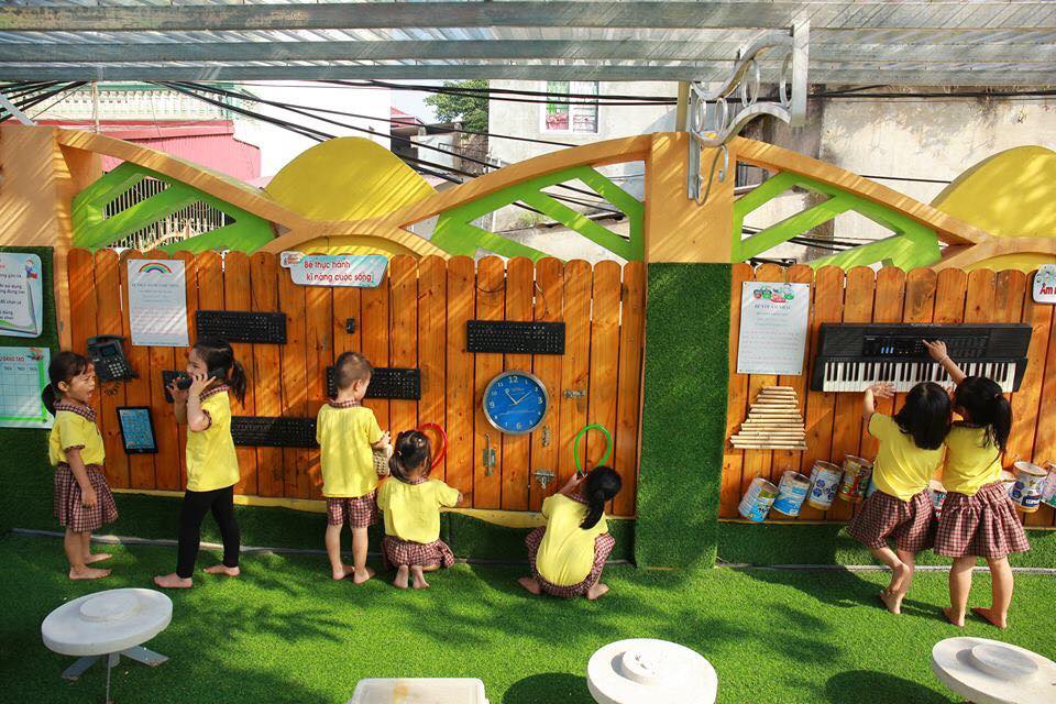 Trường có hệ thống sân chơi rộng rãi, sạch đẹp, có các khu vui chơi với đầy đủ các loại đồ chơi ngoài trời, có khu bể cát, bể vầy, khu vui chơi sáng tạo để cho các con khám phá, trải nghiệm.
