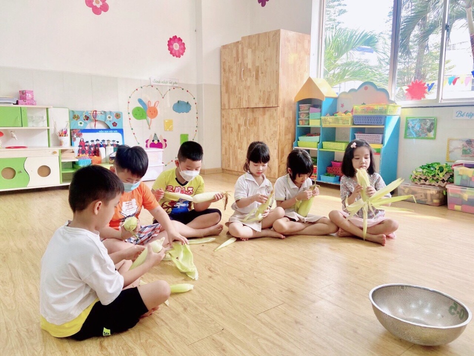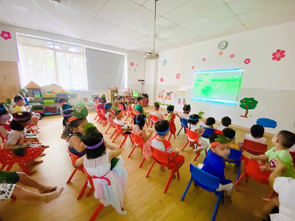 - 1 lớp lá: được trang bị máy điều hòa, tivi, máy vi tính, giường , tủ, gối, kệ đồ chơi, đồ dùng dạy học hiện đại, đầy đủ ...phù hợp cho trẻ hoạch động.