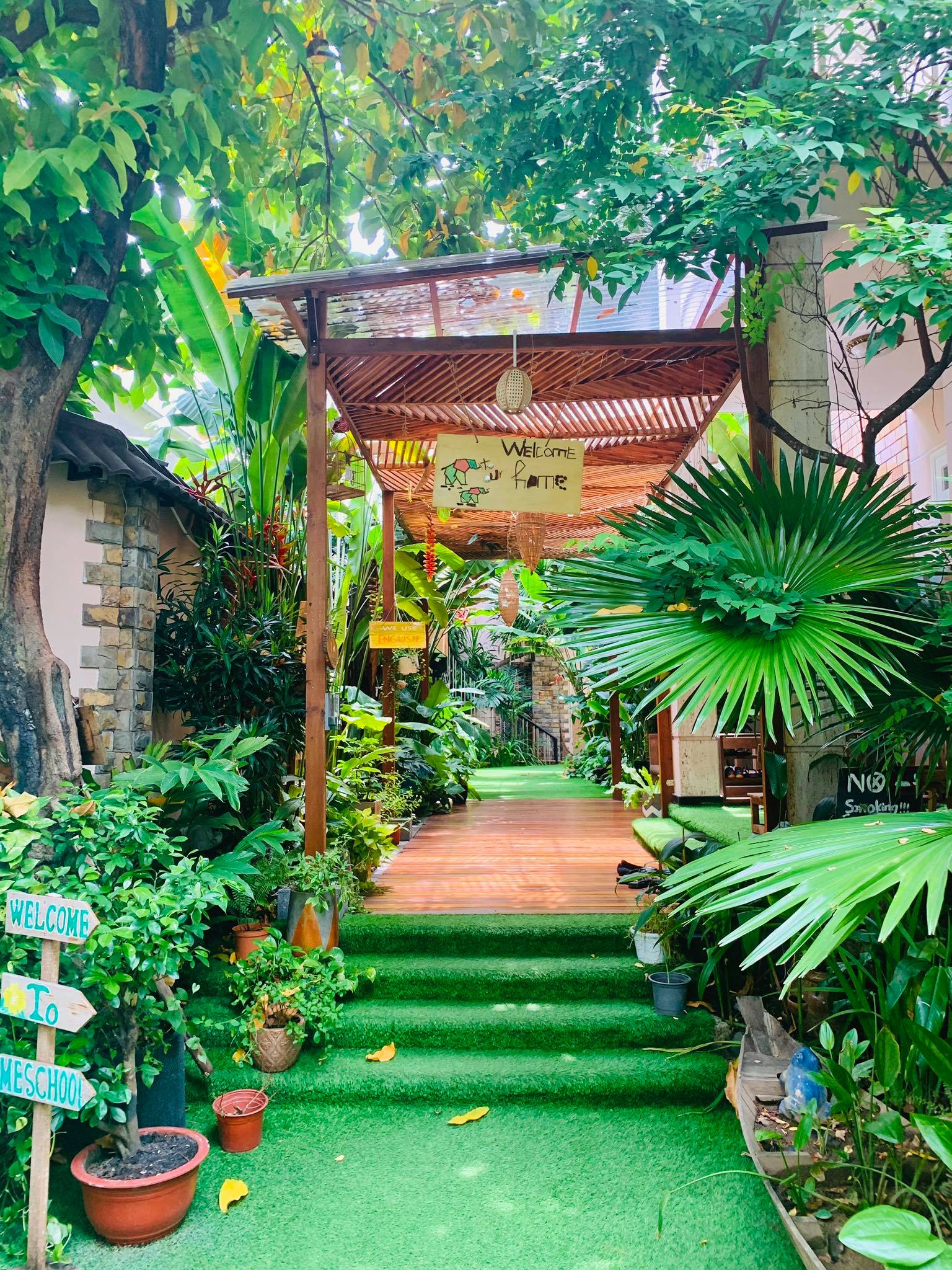 "Trường nằm trong hẻm nên rất yên tĩnh và tránh xa tiếng ồn nhưng hơi nhiều muỗi vì trải thảm nhân tạo bên ngoài, mưa gây ẩm thấp."